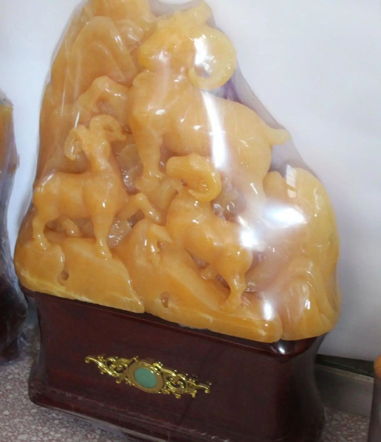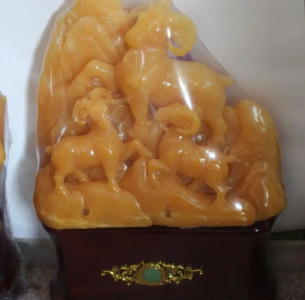 ORIGINAL 28" China Natural Yellow Jade Zodaic Year Animal Three Sheep Goat Family Statue